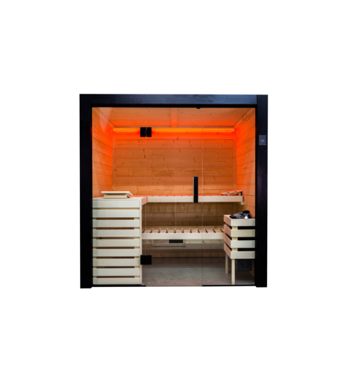 Infrarot-Set inklusive PRO-D2i Saunasteuerung, PRO-D2-CU Zusatz-Bedienteil, Infrarotstrahler ECO - 350W, Saunaofen sentiotec 190E - 9kW, Saunasteine, Bankfühler F2.